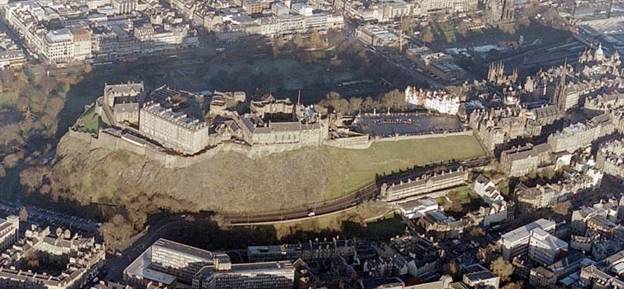 One class of feature among several in the Edinburgh area he ascribed to a "diluvial wave" was represented by Edinburgh Castle. The castle itself sits on a volcanic pipe (the rocky mass under the castle). Hall: "The rock itself . . . consists of one of the most complete and uniform masses of whinestone that is known in this country. Its form is rudely cylindrical, and from it the ridge upon which the Old Town stands, composed partly of deposites, and partly of protected strata, extends, gently sloping, for about a mile to the eastward, from the Castle to the Abbey of Holyroodhouse, where the tail terminates."