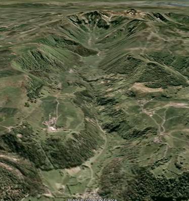 In the foreground of this Auvergne valley we can see that the river has cut a steep-sided, v-shaped valley through a "recent" flat-topped lava flow; but, the upper-reaches of the valley have a different, much wider form. Could the same river have accomplished both?